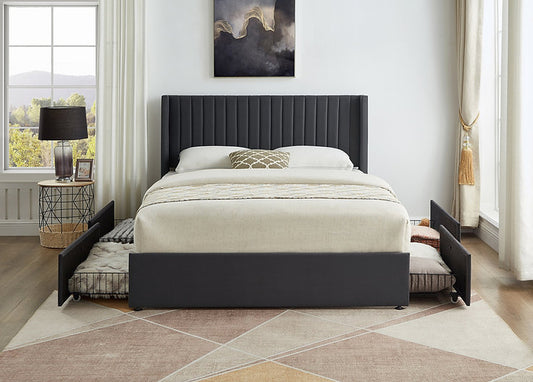 Grey Velvet Wingback Storage Platform Bed with 4 Wire Mesh Storage Drawers