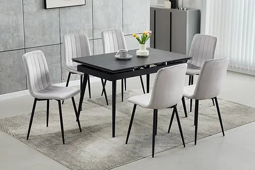 7-Piece Dining Set Sintered Stone White Marble Top Extendible Table with Soft Grey Velvet, Stitching Details & Black Steel Legs