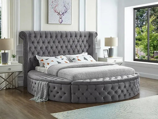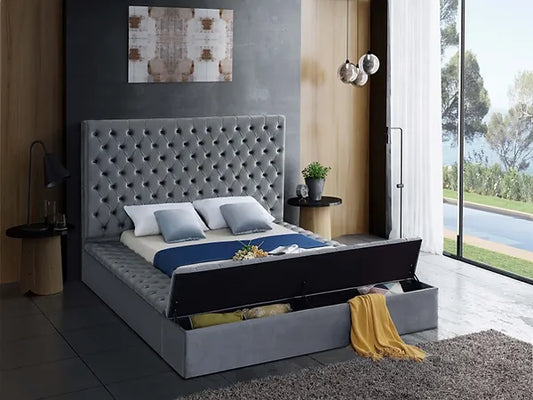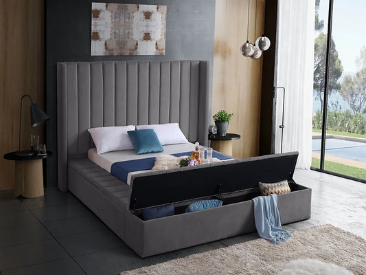 Grey Velvet Winged Storage Bed with Deep Tufting & Nailhead Trim